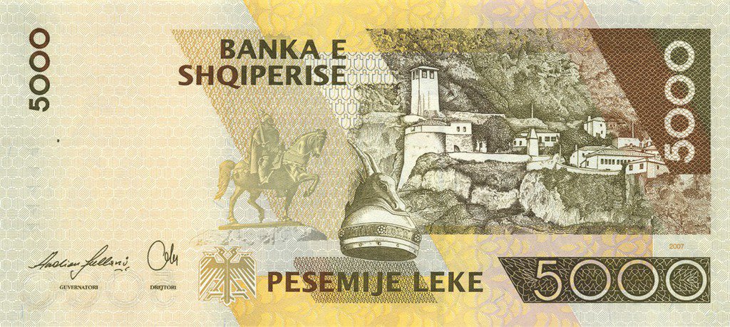 The 5000 L banknote is Albania’s highest value banknote. On the 5000 Lekë bill is the portrait of legendary military commander Skanderbeg, leader of the Albanian Revolt against the Ottoman Empire. The back side of the 5000 leke note shows Krujë Castle, in which Skanderbeg and his troops withstood three massive sieges from the Turks in the 15th Century.