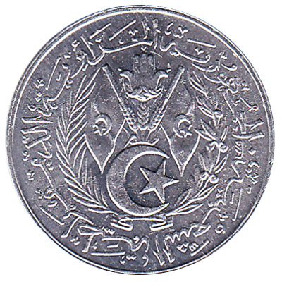 The Central Bank of Algeria issued Algarian Dinar coins in 15 different denominations, including this 1 Centime coin Algeria (1964). They are part of the Algerian Dinar coins series. The Central Bank of Algeria started issuing these 0.01 Algarian Dinar coins in 1964. They were withdrawn from circulation in 1992.