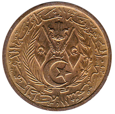 The Central Bank of Algeria issued Algarian Dinar coins in 15 different denominations, including this 10 Centimes coin Algeria (1964). They are part of the Algerian Dinar coins series. The Central Bank of Algeria started issuing these 0.1 Algarian Dinar coins in 1964. They were withdrawn from circulation in 1992.