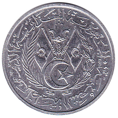 Algeria’s first emblem is pictured on the obverse side of this 2 centimes coin. This coin has a smooth edge and is silver coloured.