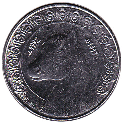The Central Bank of Algeria issued Algarian Dinar coins in 15 different denominations, including this 1/2 Algerian Dinar coin (Barb horse). They are part of the Algerian Dinar coins series. The Central Bank of Algeria started issuing these 0.5 Algarian Dinar coins in 1992. They are currently still in circulation.