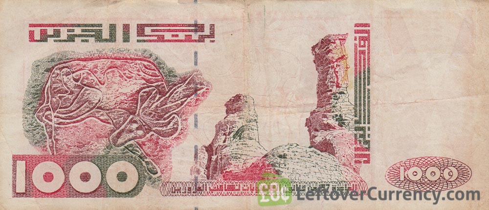 Extra security features were added to the 1000 dinar banknote, including a holographic security foil strip. The 1998-dated 1000 dinars bill has the same design as the earlier version, showing prehistoric cave paintings found in Tassili n’Ajjer (front side) and the Hoggar Mountains (back side).