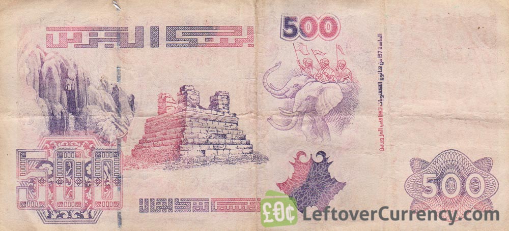 Algeria’s 500 dinars banknote from 1998 has a holographic security foil on the front side. The banknote’s design is identical to the 1992 version: Hannibal and his elephants are on the front side. The back side of the 500 D.A. bill shows to Algerian tourism hotspots: the hot springs of Hamman Debagh and the tomb of King Masinissa in Constantine.