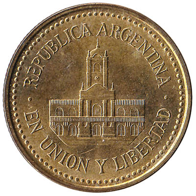 The 25 centavos coin from Argentina is worth 1/4th of an Argentinian Peso. The 25 centavos piece features the Buenos Aires Cabildo building.