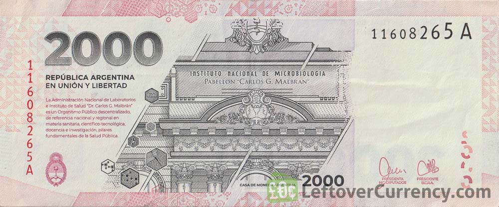 This 2000 Argentine Pesos banknote is a tribute to Public Health and the progress of science and medicine in Argentina. The front of this dos mil pesos bill features portraits of Grierson and Carrillo, two pioneers in medicine in Argentina. On the backside of the commemorative 2000 ARS bill from 2023 is an image of the National Institute of Microbiology.