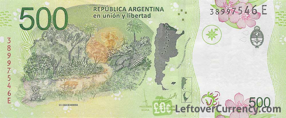 This green coloured 500 Quinientos Pesos bill from the Fourth Series features a jaguar. The wild jungle animal is shown on both sides of the $500 pesos banknote, on the back side with cub. The five hundred pesos banknote is dedicated to the Yungas region in Argentina.