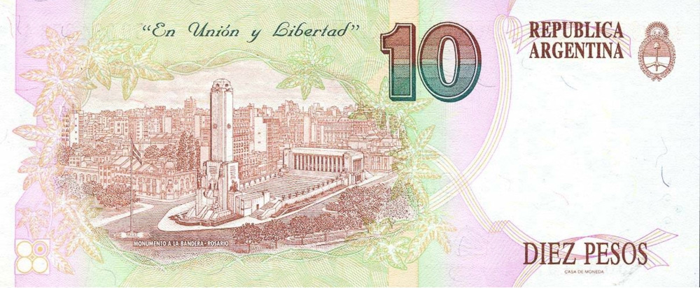- Text: 10, Banco Central de la República Argentina, CONVERTIBLES DE CURSO LEGAL, DIEZ PESOS, En Union y Libertad, Manuel Belgrano, MONUMENTO A LA BANDERO – ROSARIO, REPUBLICA ARGENTINA