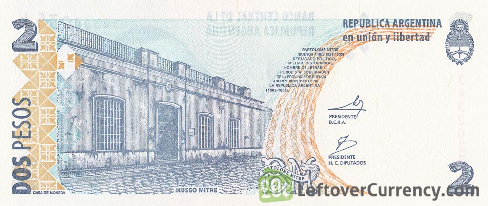 The $2 pesos banknote from Argentina was replaced by a coin. The cancelled dos pesos bill features Argentinian writer and statesman Bartolomé Mitre. His portrait is shown on the front side and the Mitre Museum, named after him, is pictured on the back side.