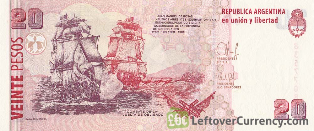 Army officer and Argentine Confederation leader Juan Manuel de Rosas is on the portrait of the $20 Argentine Pesos banknote. The back of the 20 veinte pesos bill features two sailing ships in a naval battle with the text “Combate de la Vuelta de Obligado”. The Battle of Vuelta de Obligado was fought in 1845 between the Argentinian and Anglo-French fleets.