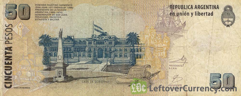 The portrait on the $50 Argentine Pesos banknote is that of Argentina’s 7th President Domingo Faustino Sarmiento. The historical building on the back side of the Cincuenta Pesos bill is the office of the Argentinian President, known as ‘Casa Rosada’ or ‘Casa de Gobierno’, based in Argentina’s capital city Buenos Aires.