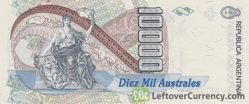 The Banco Central de la Republica Argentina issued Argentine Peso banknotes in 12 different denominations, including this 10000 Argentine Australes banknote. They are part of the withdrawn obsolete Argentine Austral banknotes series. The Banco Central de la Republica Argentina started issuing these 10000 Argentine Peso banknotes in 1989. They were withdrawn from circulation in 1992.