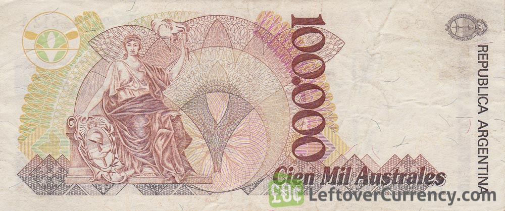 The Banco Central de la Republica Argentina issued Argentine Peso banknotes in 12 different denominations, including this 100000 Argentine Australes banknote. They are part of the withdrawn obsolete Argentine Austral banknotes series. The Banco Central de la Republica Argentina started issuing these 100000 Argentine Peso banknotes in 1990. They were withdrawn from circulation in 1993.