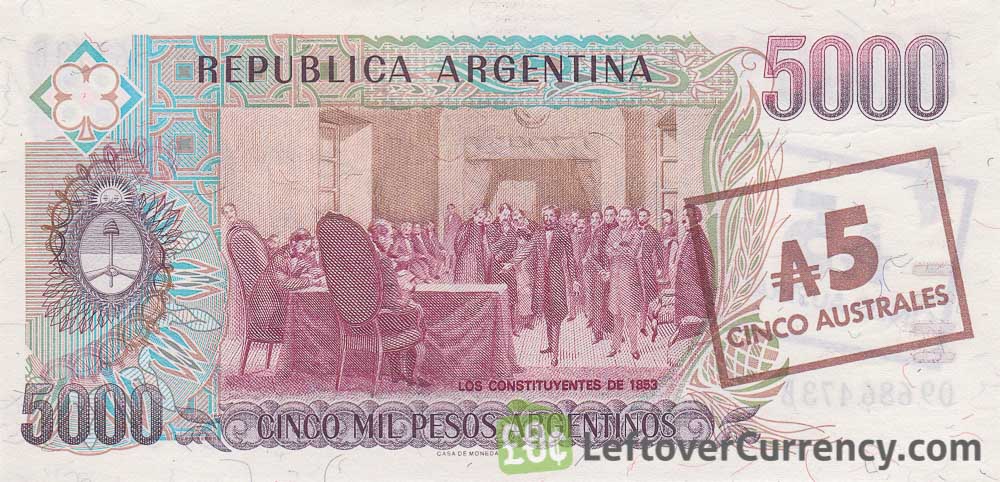 - Text: 5000, A5, Banco Central de la República Argentina, Cinco Australes, Cinco Mil Pesos Argentinos, El Paso de Los Andes, Los Constituyentes de 1853, REPUBLICA ARGENTINA