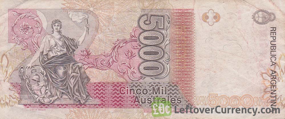 The Banco Central de la Republica Argentina issued Argentine Peso banknotes in 12 different denominations, including this 5000 Argentine Australes banknote. They are part of the withdrawn obsolete Argentine Austral banknotes series. The Banco Central de la Republica Argentina started issuing these 5000 Argentine Peso banknotes in 1988. They were withdrawn from circulation in 1992.