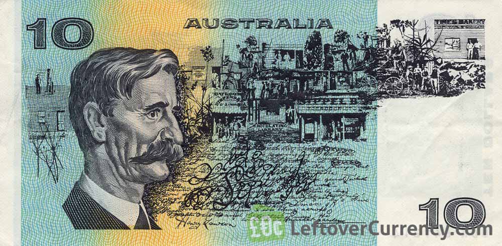 This ten dollars banknote depicts the portraits of Francis Greenway and Henry Lawson. On the paper note a caption reads ‘Australia’.