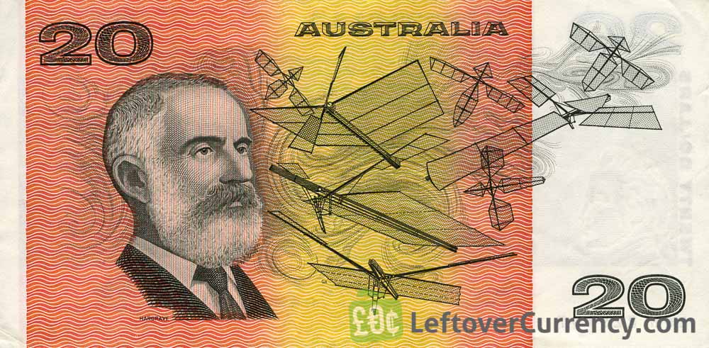 The banknote of twenty dollars has the image of Sir Charles Kingsford-Smith and Lawrence Hargrave. The word ‘Australia’ is printed on the paper banknote.