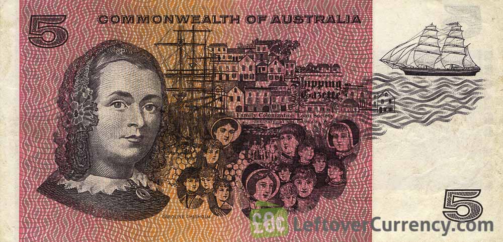 This five dollars banknote features Caroline Chisholm and Sir Joseph Banks. Printed on the paper note is the text ‘Commonwealth of Australia’.