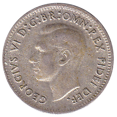 The Reserve Bank of Australia issued Australian Pound coins in 8 different denominations, including this Australian threepence coin. They are part of the Australian Pound coins series. The Reserve Bank of Australia started issuing these 0.0125 Australian Pound coins in 1938. They were withdrawn from circulation in 1964.
