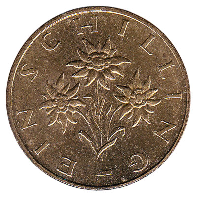 The Austrian coin of 1 schilling shows the edelweiss flower that growns in the Austrian mountains. The front side of the coin contains the text ‘Republik Österreich’.