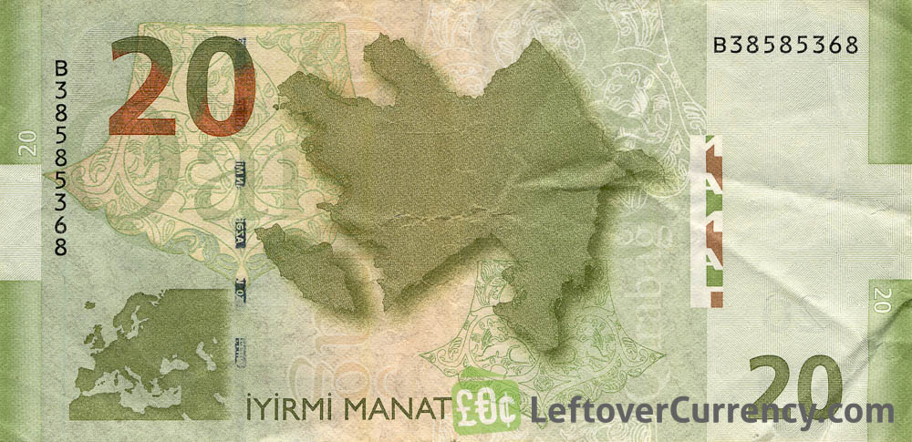 The olive-green coloured banknote of 20 Azerbaijani manat features traditional weaponry, including a helmet and sword. The back side of the Iyirmi manat bill shows two maps: A map of Azerbaijan and a map of Europe.