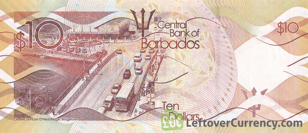 - Text: 10, BB $, Bridgetown, Central Bank of Barbados, Charles Duncan O'Neal Bridge Bridgetown, De la Rue, Pride and Industry, Right Excellent Charles Duncan O'Neal, Ten Dollars, These notes are legal tender for the payment of any amount