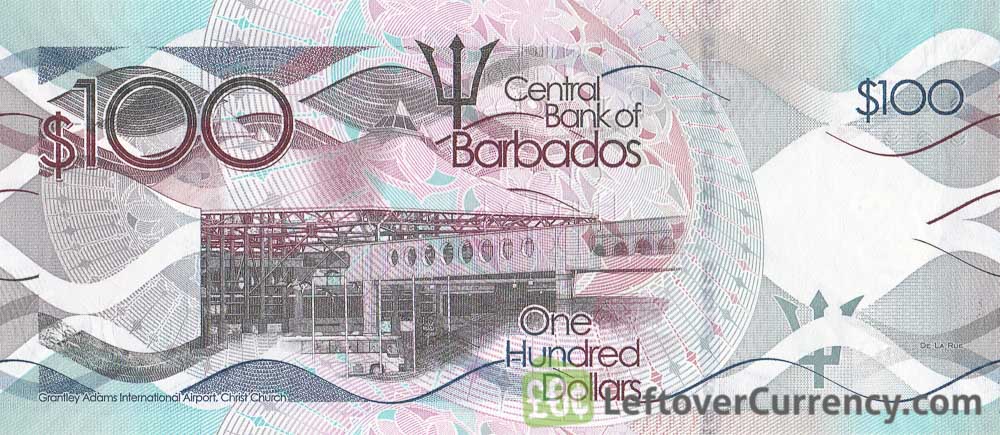 - Text: $D BBThese notes are legal tender for the payment of any amount, 100, Bridgetown, Central Bank of Barbados, De la Rue, Grantley Adams International Airport Christ Church, One Hundred Dollars, Pride and Industry, Right Excellent Sir Grantley Adams