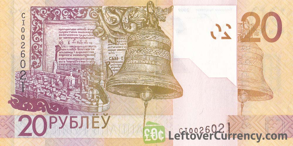 The yellow-coloured banknote of 20 rubles from Belarus features Gomel Palace, the residence of Field Marshal Pyotr Rumyantsev and Prince Paskevich. On the back side of the 20 BYN bill is an image of the oldest Belarusian manuscript book called “The Turov Gospel”, pictured alongside a bell and a view on the old city of Turov.
