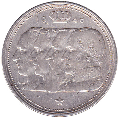 The Royal Belgian Mint issued Belgian Franc coins in 12 different denominations, including this 100 Belgian Francs coin (Four Kings). They are part of the Belgian Franc coins series. The Royal Belgian Mint started issuing these 100 Belgian Franc coins in 1948. They were withdrawn from circulation in 1979.