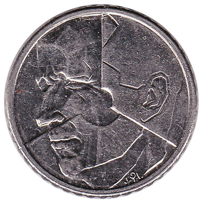 The stylised portrait of the late King Baudouin I of Belgium is on the obverse side of this 50 Belgian Francs coin. The silver coloured 50F piece has a reeded edge and measures 22.75mm in diameter.