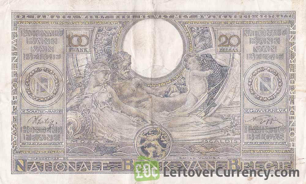 The National Bank of Belgium issued Belgian Franc banknotes in 11 different denominations, including this 100 Belgian Francs 20 Belgas banknote (type Vloors gray Dutch-French). They are part of the demonetized Belgian Franc banknotes series. The National Bank of Belgium started issuing these 100 Belgian Franc banknotes in 1933. They were withdrawn from circulation in 1943.