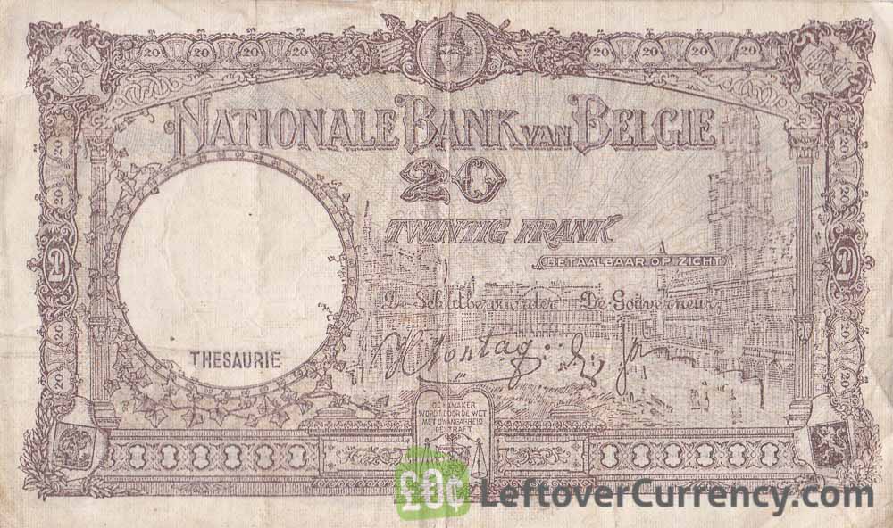 - Text: 20, Banque Nationale De Belgique, National Bank Van Belgie, Twintig Frank, Vingt Francs