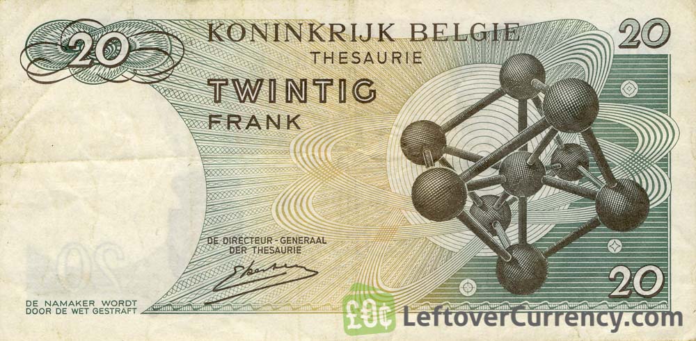 The banknote of vingt francs – twintig frank depicts the image of Baudouin I , King of Belgium. Printed on the note is the text ‘Royaume de Belgique trésorerie’.