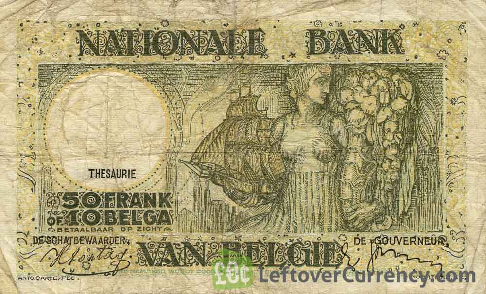 The Belgian Treasury issued Belgian Franc banknotes in 3 different denominations, including this 50 Belgian Francs Treasury banknote (Anto-Carte). They are part of the demonetized Belgian Franc Treasury banknotes series. The Belgian Treasury started issuing these 50 Belgian Franc banknotes in 1928. They were withdrawn from circulation in 1948.