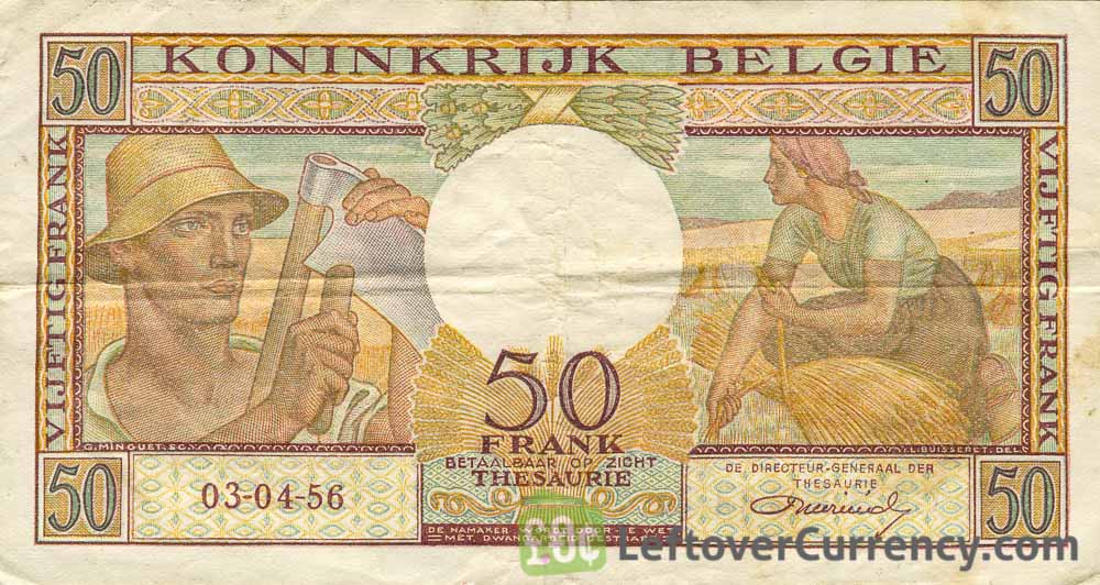 The Belgian banknote of cinquante francs – vijftig frank features farmers and a fruit basket. The words ‘Royaume de Belgique trésorerie’ are printed on the note.