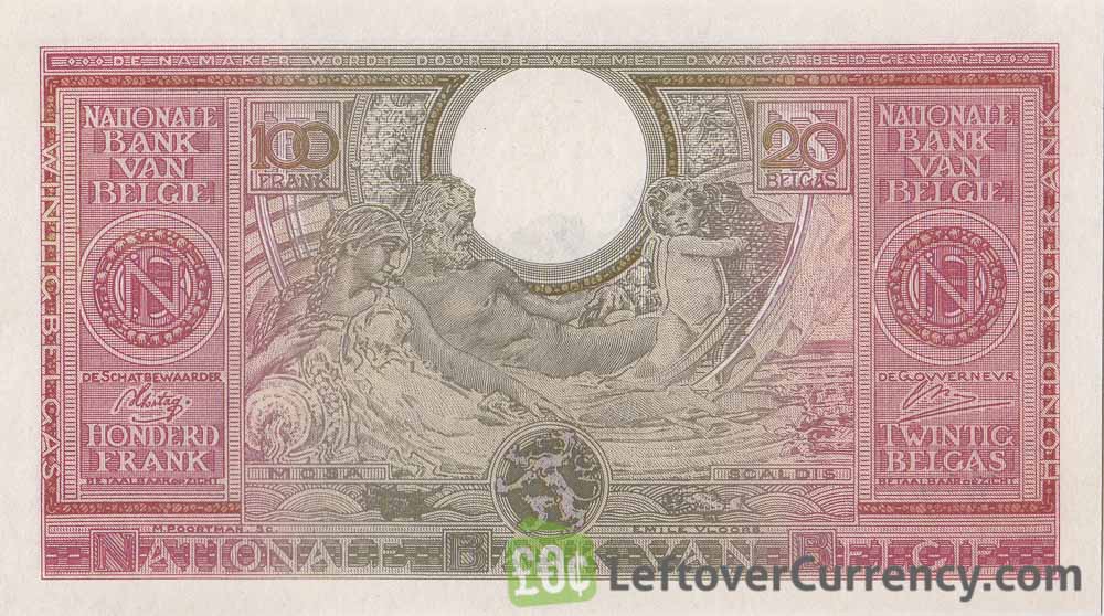- Text: 100 Francs, 20 Belgas, Banque Nationale De Belgique, Cent Francs, Nationale Bank Van Belgie, Vingt Belgas