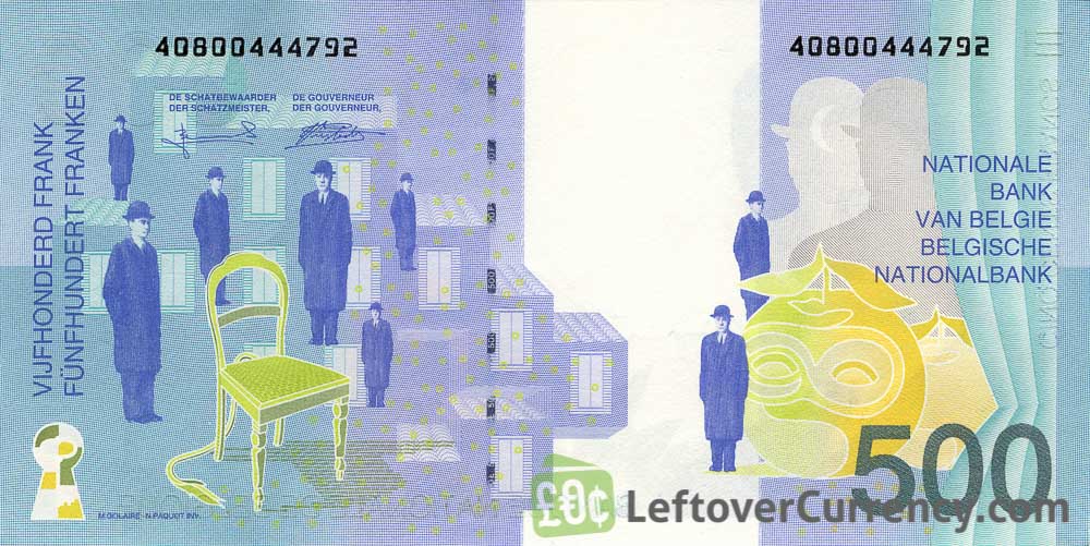 The National Bank of Belgium issued Belgian Franc banknotes in 12 different denominations, including this 500 Belgian Francs banknote (Rene Magritte). They are part of the Belgian Franc banknotes series. The National Bank of Belgium started issuing these 500 Belgian Franc banknotes in 1998. They were withdrawn from circulation in 2002.