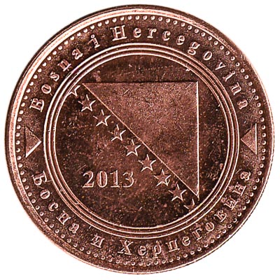 The copper-plated 50 feninga, fenings or pfenigs coin from Bosnia-Herzegovina has the denomination shown over a map of the country. The 50 feninga coin is the equivalent of half a mark. On the other side of the 50pf coin, the date of issue is shown against the triangle and stars that are part of the national Bosnian flag. The triangle theme is repeated on both sides of the coin with a single triangle on the left and the right outer edge of each face.