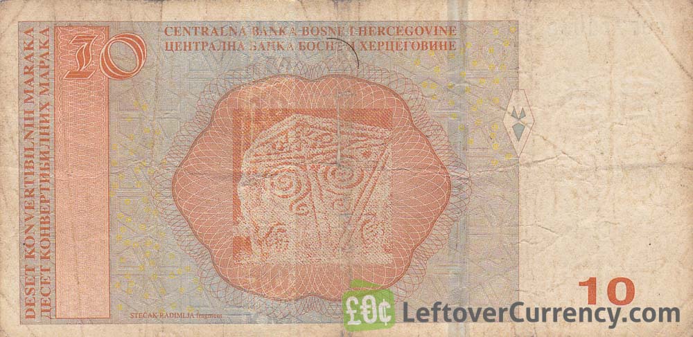 The Central Bank of Bosnia and Herzegovina issued Bosnia and Herzegovina convertible mark banknotes in 6 different denominations, including this 10 Konvertible Marks banknote Bosnian-Croatian (holographic thread). They are part of the current Bosnia and Herzegovina convertible mark banknotes series. The Central Bank of Bosnia and Herzegovina started issuing these 10 Bosnia and Herzegovina convertible mark banknotes in 2012. They are currently still in circulation.