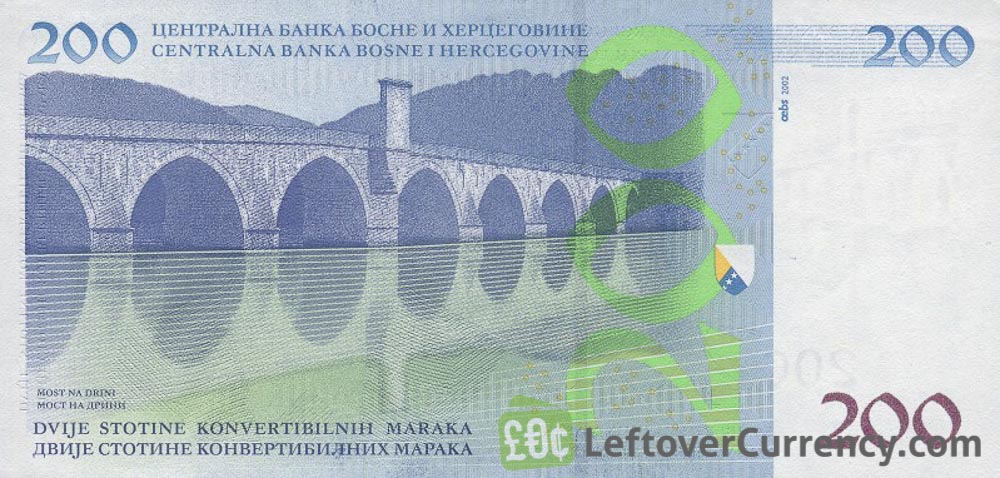 The Central Bank of Bosnia and Herzegovina issued Bosnia and Herzegovina convertible mark banknotes in 6 different denominations, including this 200 Konvertible Marks banknote Bosnian-Croatian (2002 version). They are part of the current Bosnia and Herzegovina convertible mark banknotes series. The Central Bank of Bosnia and Herzegovina started issuing these 200 Bosnia and Herzegovina convertible mark banknotes in 2002. They are currently still in circulation.