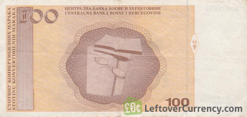 The 100 Republika Srpska convertible mark banknote shows the Bosnian Serb politician, author, poet and playwright Petar Kočić on one side, and pen, reading glasses and books on the back.