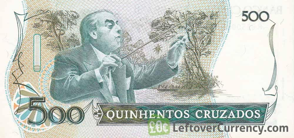 The Banco Central Do Brasil issued Brazilian Cruzado banknotes in 7 different denominations, including this 500 Brazilian Cruzados banknote (Heitor Villa-Lobos). They are part of the Brazilian Cruzados banknotes series. The Banco Central Do Brasil started issuing these 500 Brazilian Cruzado banknotes in 1986. They were withdrawn from circulation in 1989.