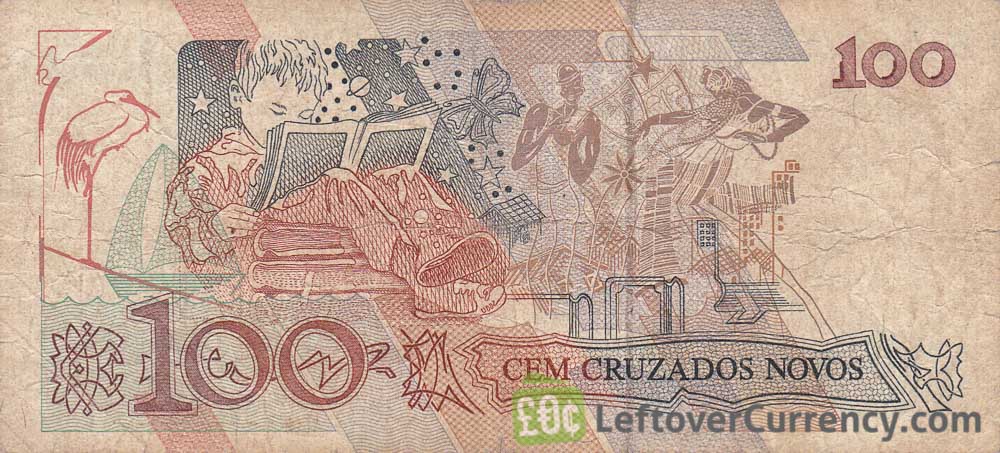 The 100 Cruzados Novos banknote features Brazilian writer Cecília Meireles, one of the great female poets in the Portuguese language. The front side of the NCz$100 bill shows the portrait of Meireles. The back side of the 100 Cem Cruzados Novos bill shows a child reading a book and elements of the story coming to live.