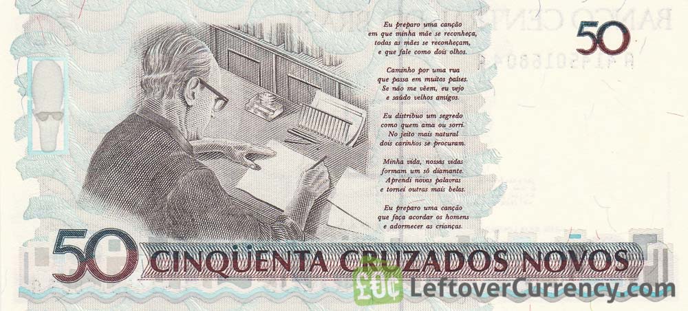 The banknote of 50 Cruzados Novos features Brazilian writer and poet Carlos Drummond de Andrade. On the back side of the Cinqüenta Cruzados Novos bill we see Drummond de Andrade at work behind his desk, next to the text of his poem “Canção Amiga”.