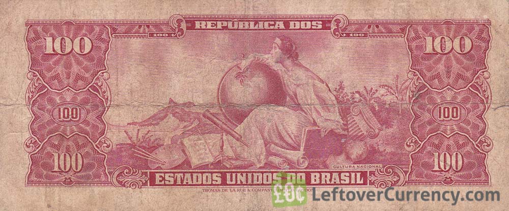 The portrait on the front side of the red-coloured 100 Brazilian Cruzeiros banknote is that of Dom Pedri II, Emperor of Brazil. The back side of the Cem Cruzeiros bill has an allegorical figure representing Culture and the text “Cultura Nacional”.