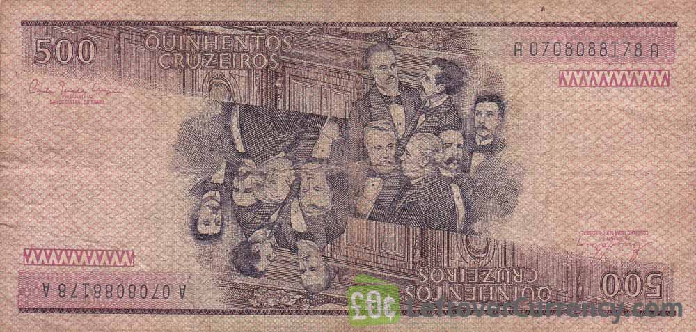 The 500 Cruzeiros banknote features Brazil’s Constitutional Congress in 1891. The reverse side of the Quinhentos Cruzeiros bill shows congressmen and Deodoro da Fonseca, whose portrait is shown on the obverse side. At the Constitutional Congress, Deodoro da Fonseca was elected Brazil’s first President after heading a military coup.