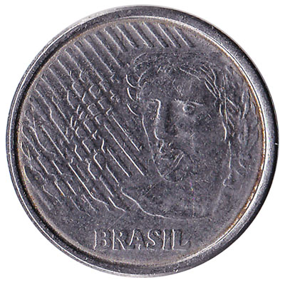 The silver coloured coin of 5 centavos from Brazil is made of stainless steel. The head of a young woman is on the obverse side, it’s the Efficy of the Republic.