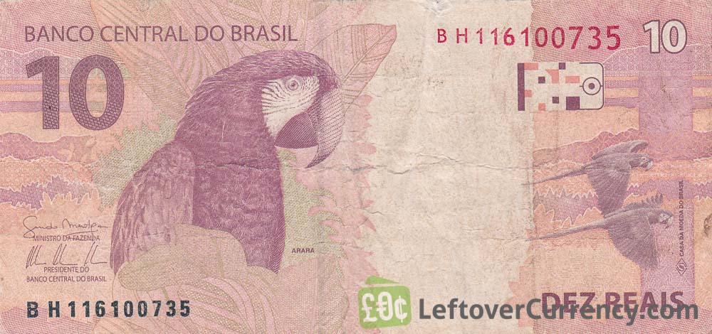 - Text: 10 REAIS, ARARA, BANCO CENTRAL DO BRASIL, DEUS SEJA LOUVADO, Dez Reais, REPUBLICA, REPUBLICA FEDERATIVA DO BRASIL