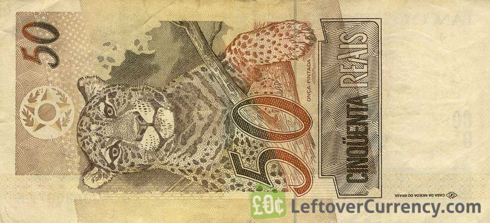 The R$50 Brazilian reais banknote shows a jaguar (panthera onca), the only panther native to South and North America. The largest jaguars are found in Brazil and Venezuela. The front of the fifty reais bill shows the national personification of Brazil, a young woman ‘Republica’ wearing a Roman style crown made of bay leaves.