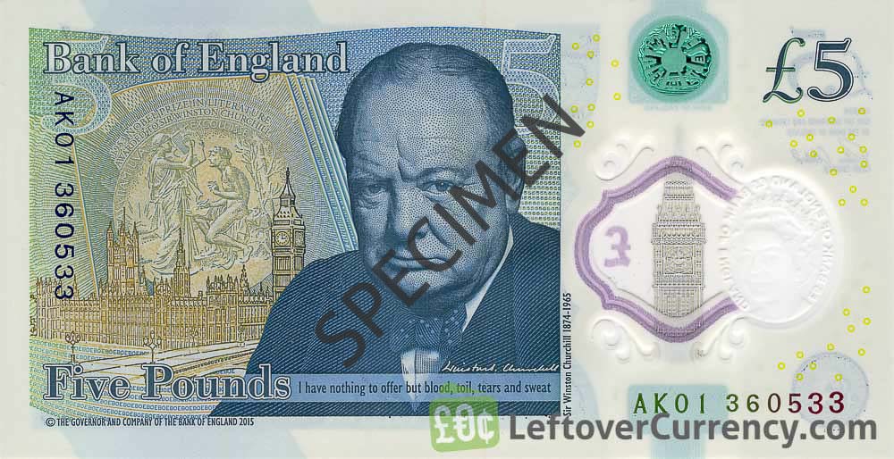 Repeat these steps for any other notes and coins you want to exchange. Complete checkout and get paid within 5 days of receiving your currencies. To exchange your Bank of England 5 Pounds Sterling polymer banknote (Winston Churchill) for cash: add it to your wallet now!