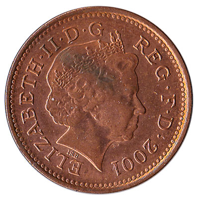 The British coin of 1 penny depicts Her Majesty The Queen. The copper plated steel coin captions ‘ELIZABETH II D G REG F D’ and ‘one penny’. Older versions of the coin have the text ‘new penny’. Before 1992, one-penny coins were made of 97% copper, which meant the melt value of the 1p coin was higher than its face value.